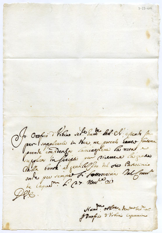 Lettera di fra Onofrio di Urbino al cardinale Annibale Albani (1717 novembre 27)