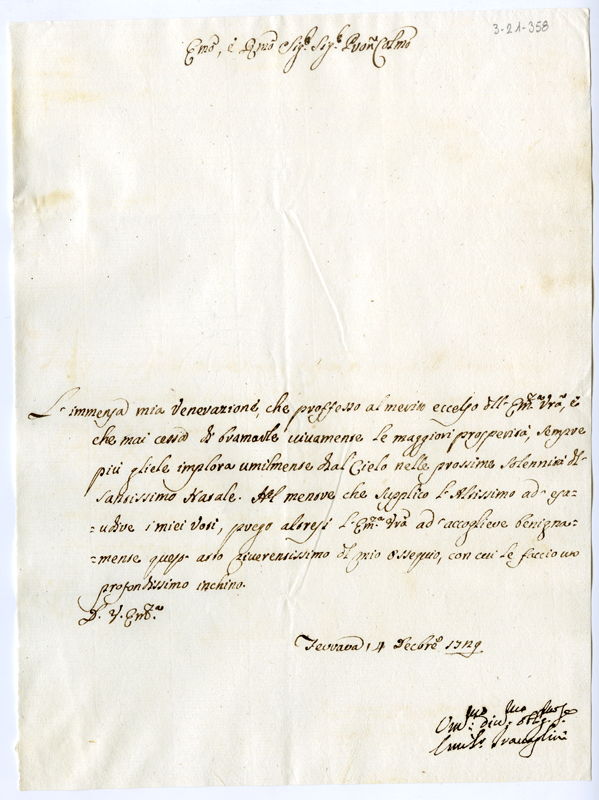 Lettera di Emiliano Travaglini al cardinale Annibale Albani (1729 dicembre 15)