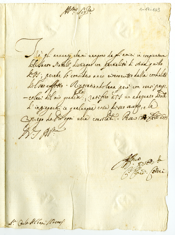 Lettera del cardinale Carlo Cerri a Carlo Albani (1671 dicembre 24)