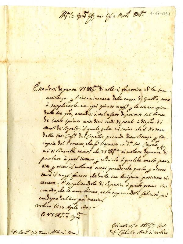 Lettera di Callisto Puccinelli, vescovo di Urbino, a Giovanni Francesco Albani (1673 aprile 17)