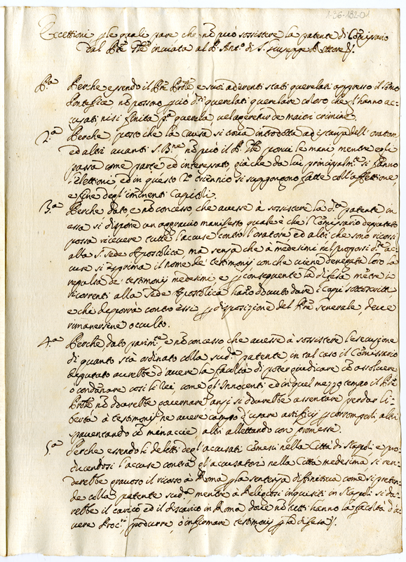 Eccettioni per le quali pare che non può sussistere la patente di Commissario dal Padre Generale inviata al Padre Antonio di San Giuseppe Rettore (1700-1721)