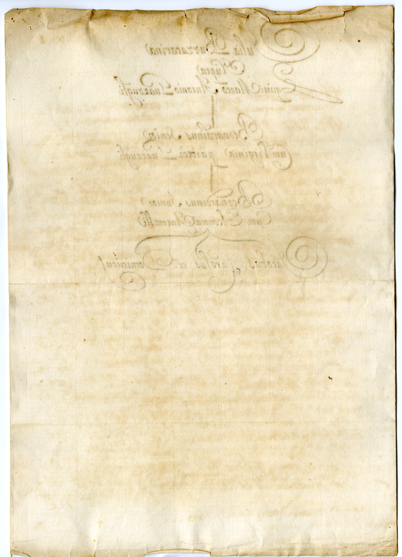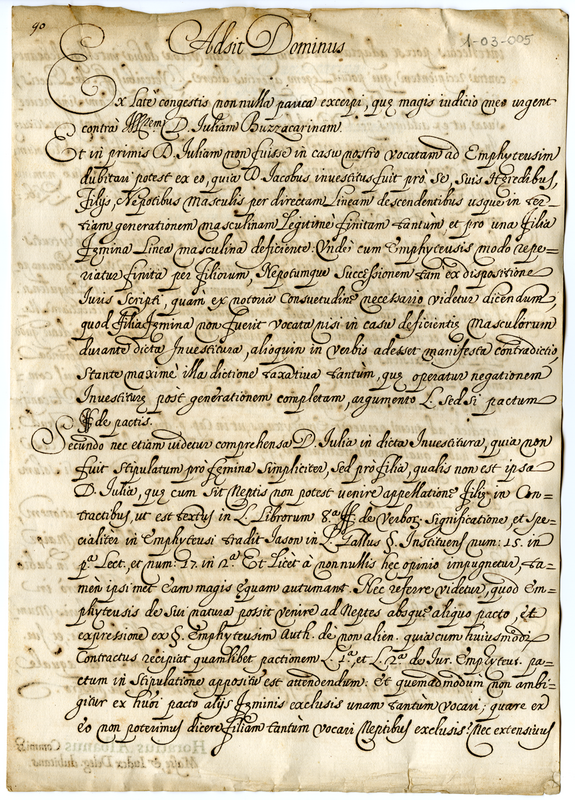 Giudizio espresso da Orazio Albani, commissario di Massa e giudice delegato, contro l'attribuzione di una enfiteusi data alla signora Bazzacarina. In terza pagina albero genealogico di Giulia Bazzacarina.