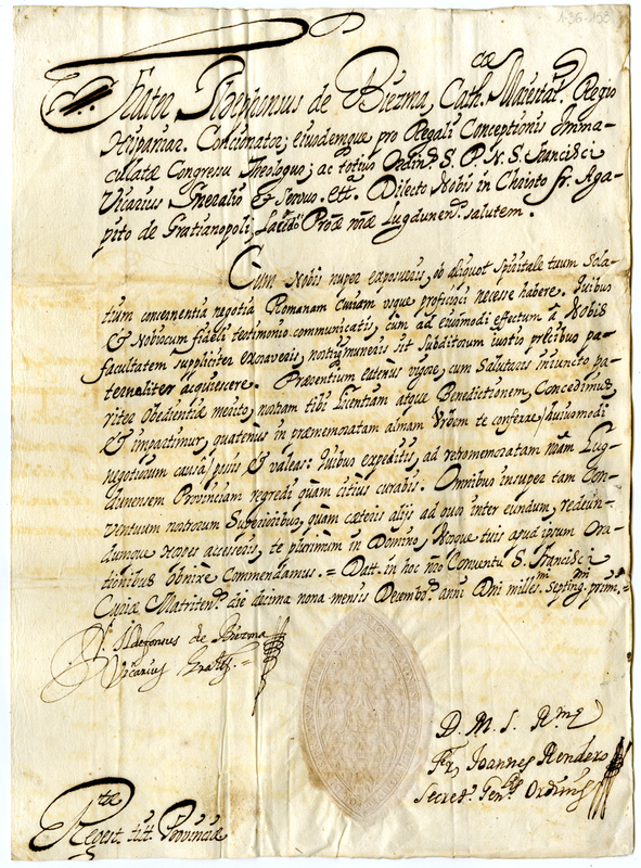 Lettera del vicario generale dell'ordine di San Francesco Ildefonso de Biezna, al padre Agapito di Grazianopoli della provincia francescana di Lione (1701 dicembre 19)