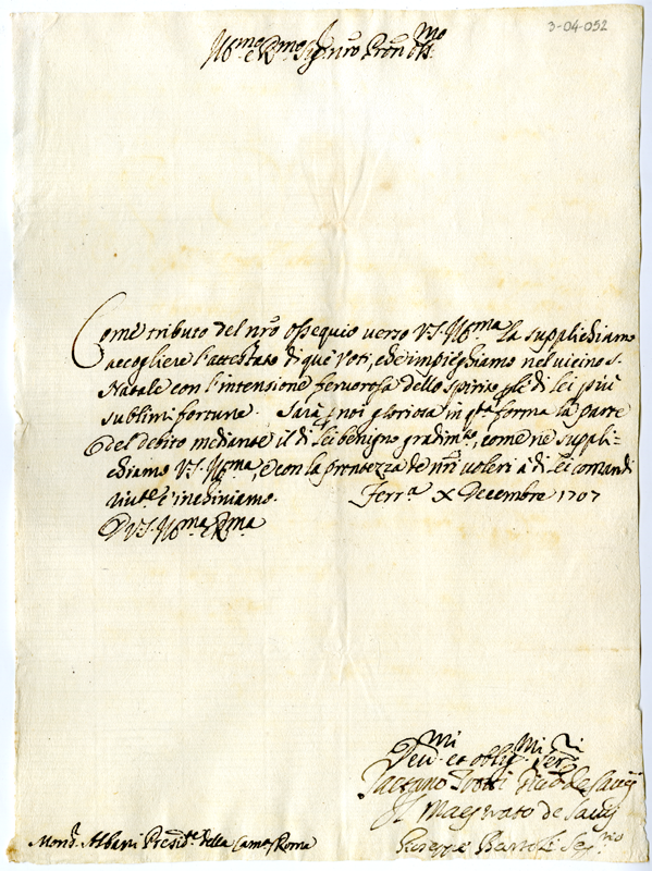 Lettera di Giuseppe Bartoli ad Annibale Albani (1707 dicembre 10)