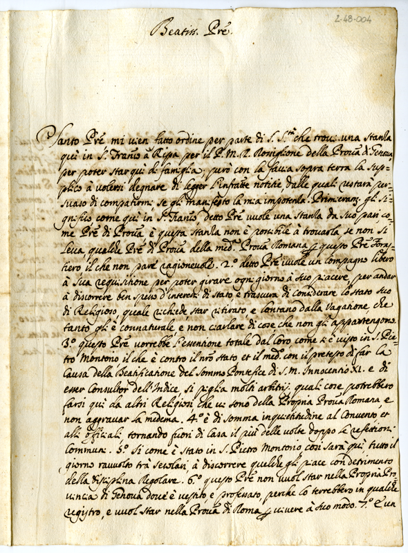 Lettera del guardiano di San Francesco a Ripa a papa Clemente XI (1700-1712)
