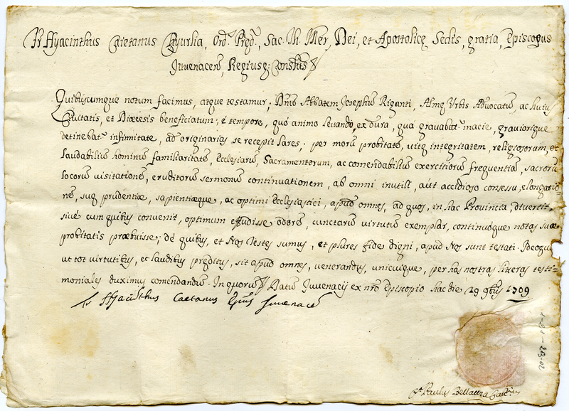 Attestato rilasciato dal vescovo Giacinto Gaetano Curlia a favore dell'abate Giuseppe Rigante (1709 novembre 29)