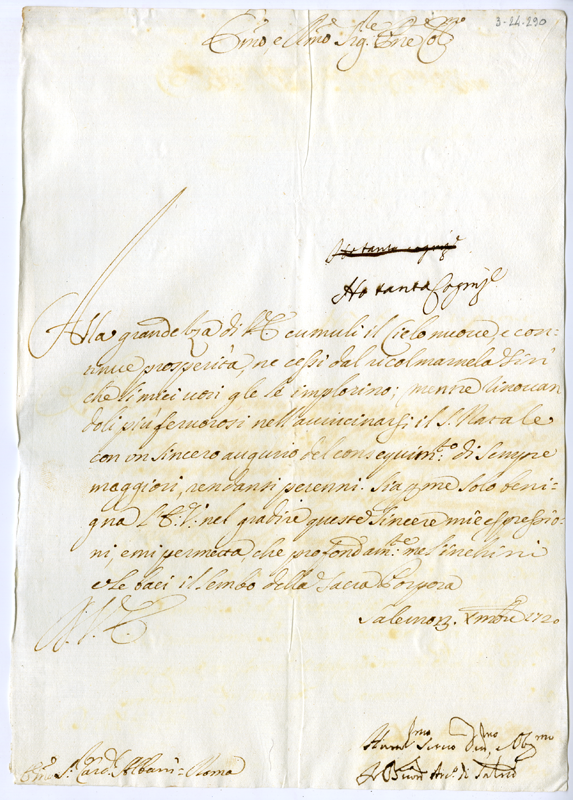 Lettera di Bonaventura arcivescovo di Salerno al cardinale Annibale Albani (1720 dicembre 13)