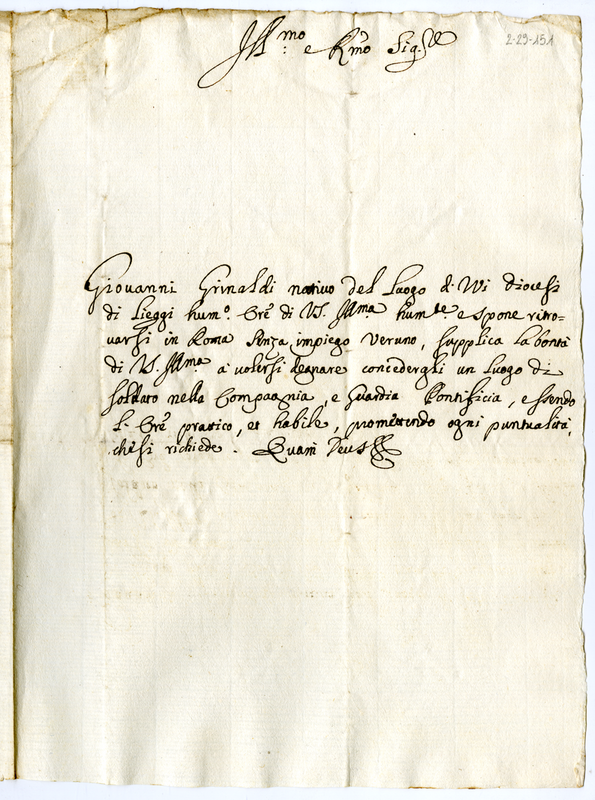 | dc.description | Ritrovandosi in Roma senza impiego chiede di aver un posto di soldato nella guardia pontificia | |