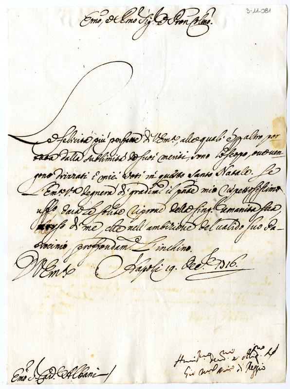 Lettera di Giovanni arcivescovo di Reggio al cardinale Annibale Albani (1716 dicembre 19)
