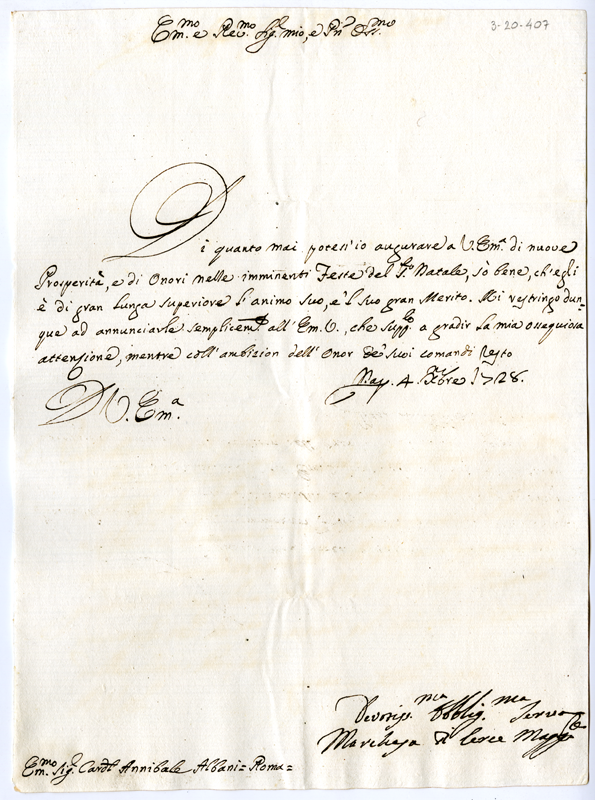 Lettera della marchesa di Cerce Maggiore al cardinale Annibale Albani (1728 dicembre 4)
