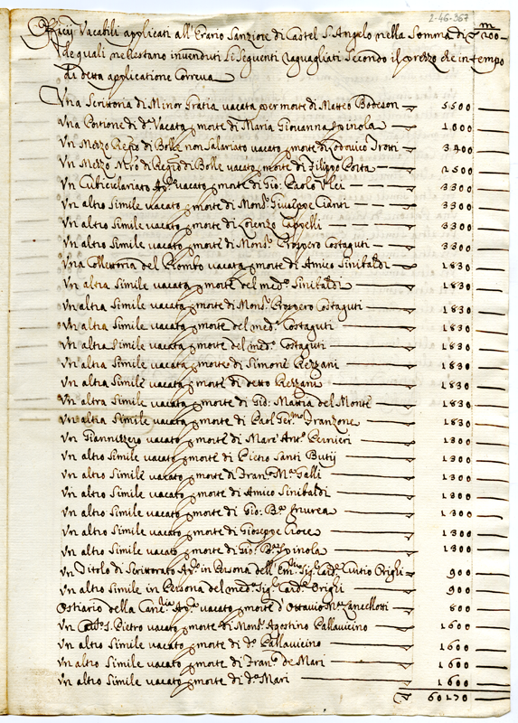 Offitii vacabili applicati all'erario sanziore di Castel Sant'Angelo nella somma di scudi 200 mila, de quali ne restano invenduti li seguenti, ragguagliati secondo il prezzo che in tempo di detta applicazione correva (1700-1721)