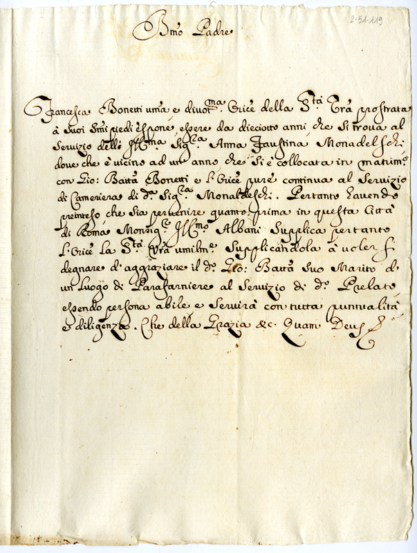 Lettera di Francesca Bonetti a papa Clemente XI (1700-1721)