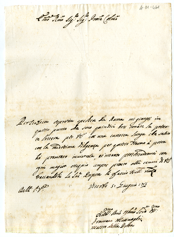 Lettera di Francesco Masinaghi al Cardinale Annibale Albani (1715 giugno 5)