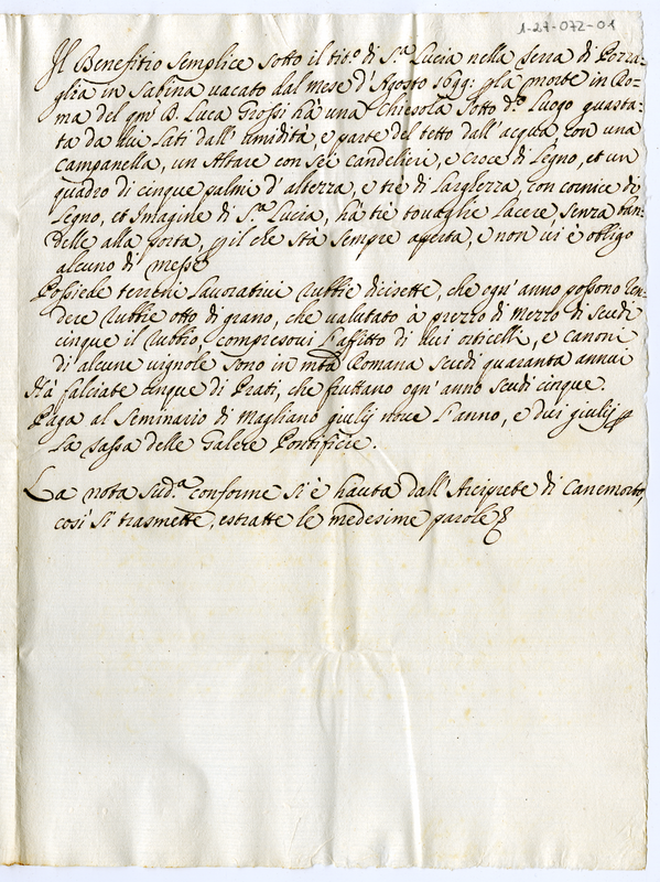 Beneficio semplice sotto il titolo di Santa Lucia nella terra di Pozzaglia vacante per morte di don Luca Grossi (1700)