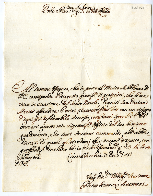 Lettera di Pietro Sovranzo Senomani al cardinale Annibale Albani (1731 dicembre 17)