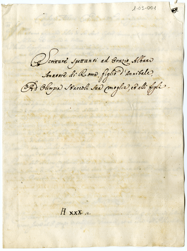 | bo.livello.titolo2 | Archivio Albani|"Scritture spettanti ad Orazio Albani Senatore di Roma, figlio di Annibale; ad Olimpia Staccoli sua moglie ed alli figli"|Documenti contenuti | |