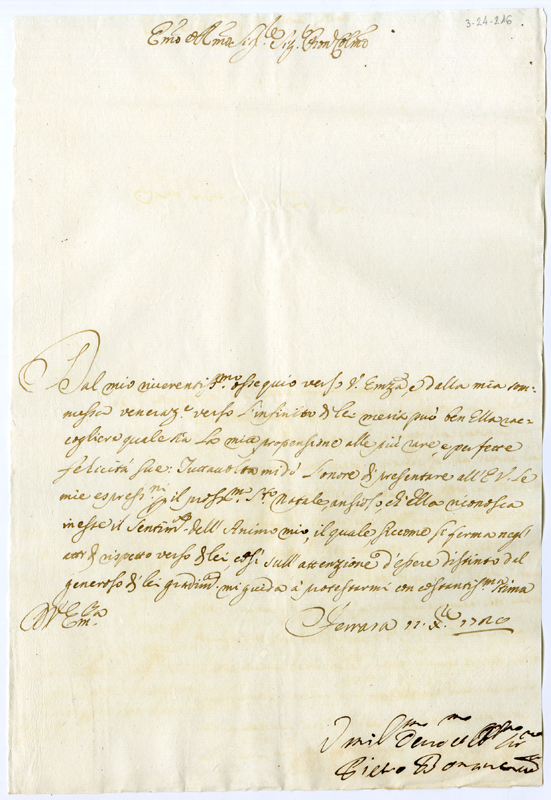 Lettera di Pietro Bonaventura al cardinale Annibale Albani (1720 dicembre 11)