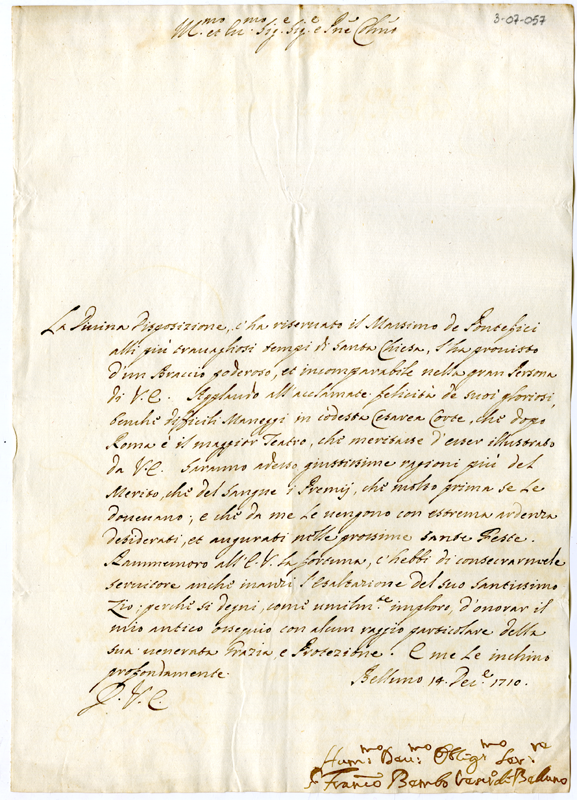 Lettera di Gianfrancesco Bembo vescovo di Belluno ad Annibale Albani (1710 dicembre 14)