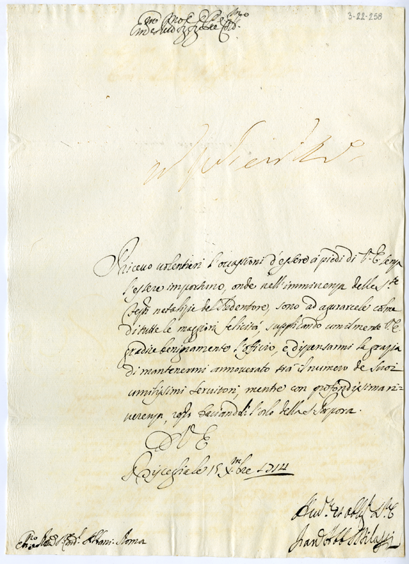 Lettera di Francesco Milazzo al cardinale Annibale Albani (1714 dicembre 15)