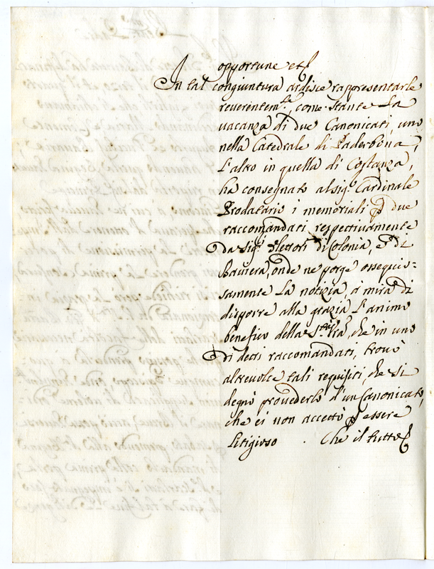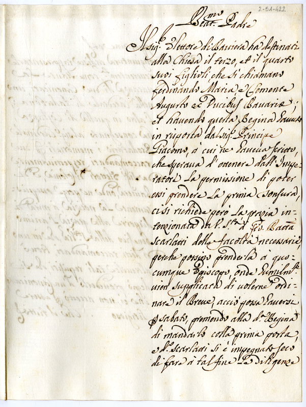 Chiede di spedire un breve a padre Giovanni Battista Scarlatti contenente le facoltà necessarie per permettere a due figli dell'elettore di Baviera di ricevere la prima tonsura. Fa presente altresì ci aver consegnato al cardinale Prodatario i memeriali per due raccomandati a due canonicati vacanti
