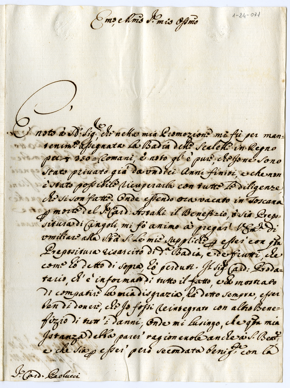 Lettera del cardinale Lorenzo Corsini al cardinale Paolucci (1721 gennaio 17)