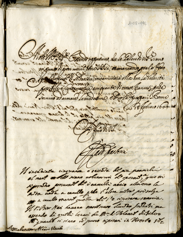Lettera del cardinale Barberini Francesco senior a Malatesta Albani (1644 febbraio 18)