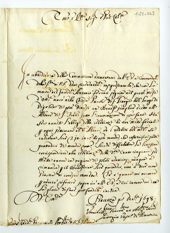 Lettera di Giorgio vescovo di Piacenza al cardinale Painciatici (1698 dicembre 1)