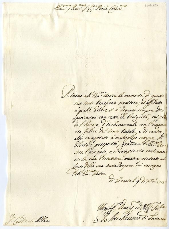 Lettera di Giovanni Battista arcivescovo di Taranto al cardinale Annibale Albani (1718 dicembre 9)