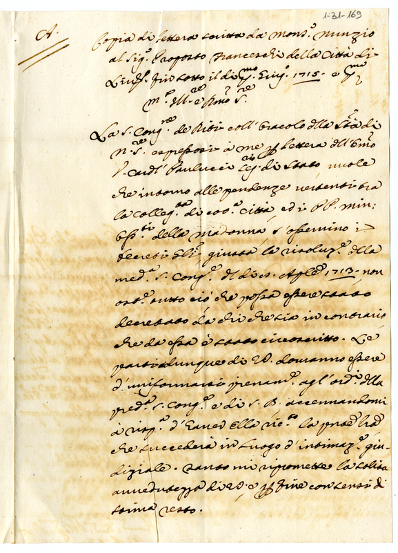 Archivio Albani|"Scritture spettanti alli frati dell'ordine de minori Conventuali, Osservanti, Riformati, Capuccini"|"1715 Livorno Lettere, e altre scritture appartenenti alle differenze vestenti tra li Frati Minori Osservanti di San Francesco di Santa Maria di Livorno, e il Proposto di quella Collegiata"|Documenti contenuti