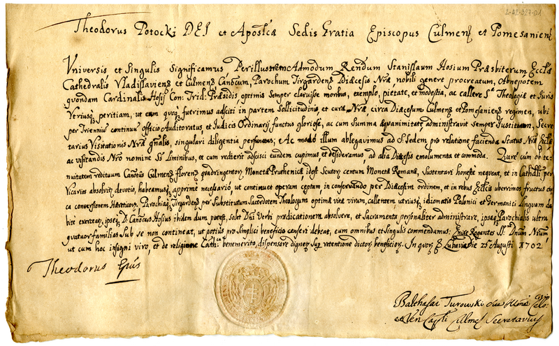 Attestazione di vita proba e conferimento del beneficio del canonicato di Culma da parte di Teodoro Potocki vescovo di Culma e Pomesania (1702 agosto 25)