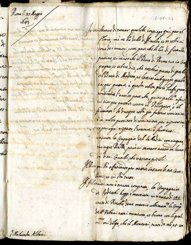 Lettera del cardinale Barberini Francesco senior a Malatesta Albani (1643 maggio 27)