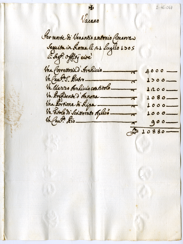 Uffici vacanti per morte di Venanzio Antonio Cimarra (1705 luglio 21)