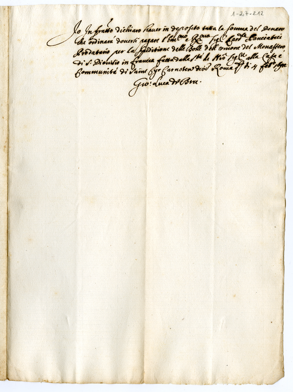 Ricevuta di una somma di danaro fatta dalla Maestà di Nostro Signore alla casa e comunità romana di Saint Cyr diocesi Chartres (1692 febbraio 4)