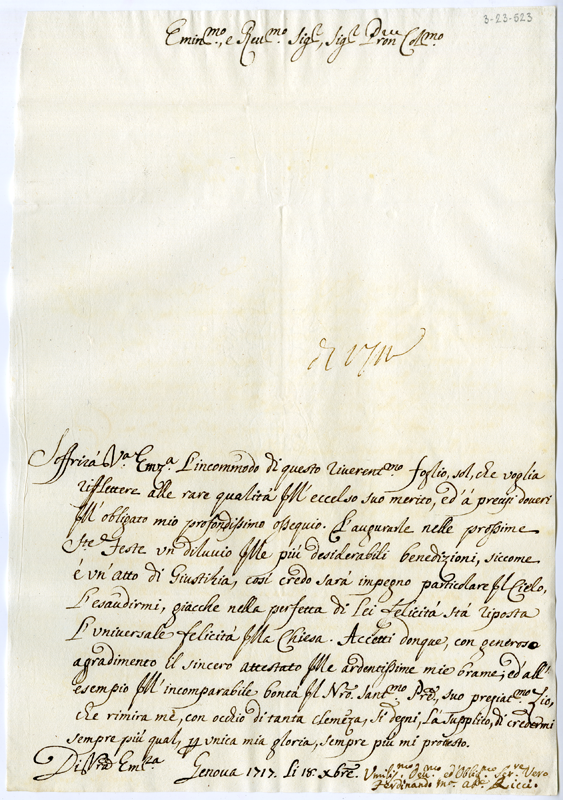Lettera di Ferdinando Maria Ricci abbate al cardinale Annibale Albani (1717 dicembre 18)