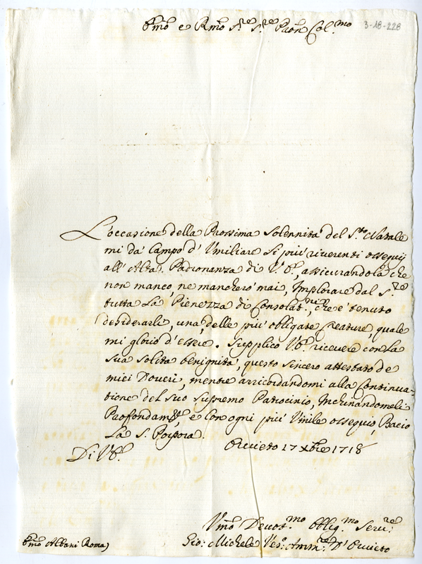 Lettera di Giovanni Michele vescovo amministratore di Orvieto al cardinale Annibale Albani (1718 dicembre 17)