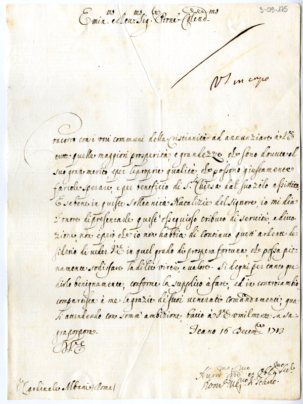 Lettera di Domenico vescovo di Teano al cardinale Annibale Albani (1713 dicembre 16)