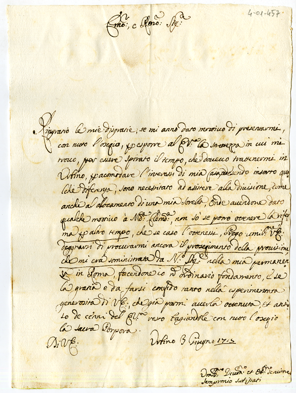 | bo.livello.titolo2 | Archivio Albani|Lettere di complimento, e di Negozio Semestre Primo|"1715 Giugno Tom. I."|Documenti contenuti | |