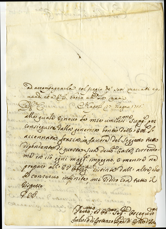 Lettera di Fulvio di Costanzo Principe di Colle d'Aversa al Cardinale Annibale Albani (1716 giugno 27)