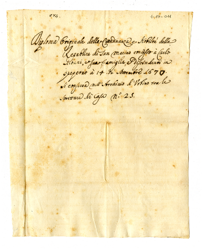 Promemoria nel quale si afferma che il diploma originale della cittadinanza e nobiltà della Repubblica di San Marino concesso a Carlo Albani e famigliari si trova nell'archivio di Urbino in "scritture di Casa n. 25"