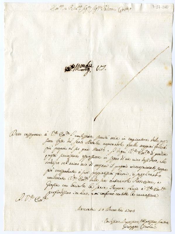 Lettera di Giuseppe Ciccolini al cardinale Annibale Albani (1723 dicembre 10)