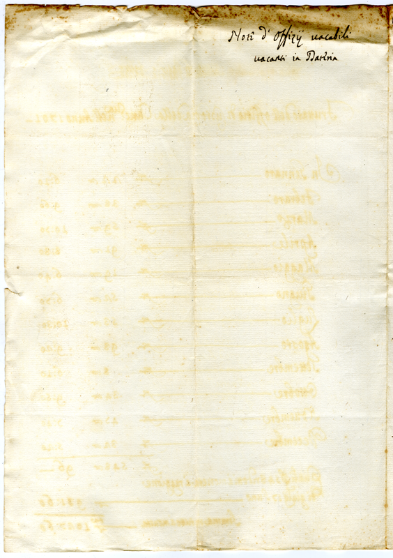 Valore dell'appresso Officii vacabili al presente vacanti in Dataria Apostolica sia nel Pontificato della Felice memoria d'Innocentio XII come anche nel Pontificato della Santità di Nostro Signore Clemente XI con le Componende di ciascheduno di essi (1691-1721)