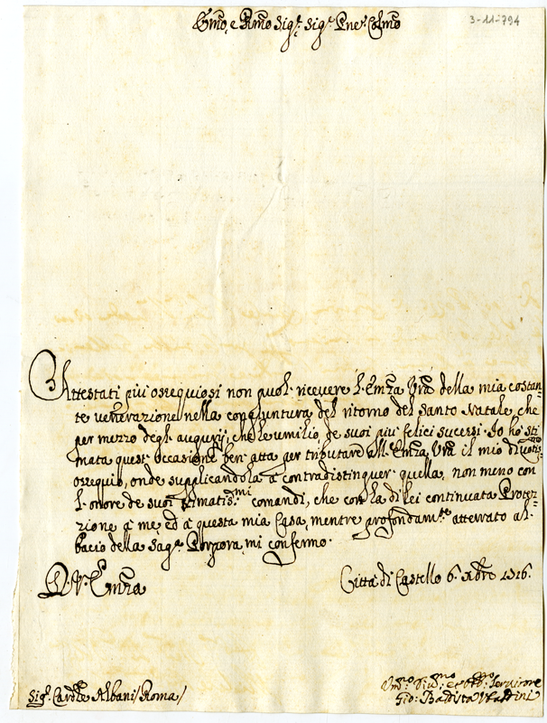 Lettera di Giovanni Battista Ubaldini al cardinale Annibale Albani (1716 dicembre 6)
