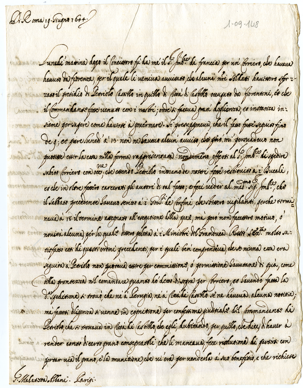 Lettera del cardinale Barberini Francesco senior a Malatesta Albani (1644 giugno 19)