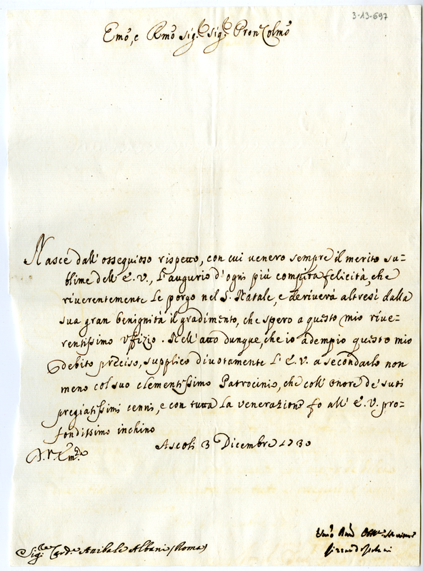 Lettera di Riccardo Isolani al cardinale Annibale Albani (1730 dicembre 3)