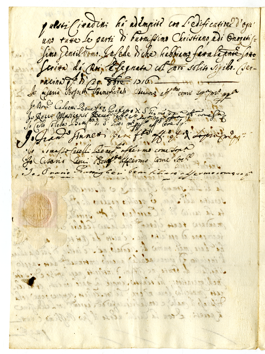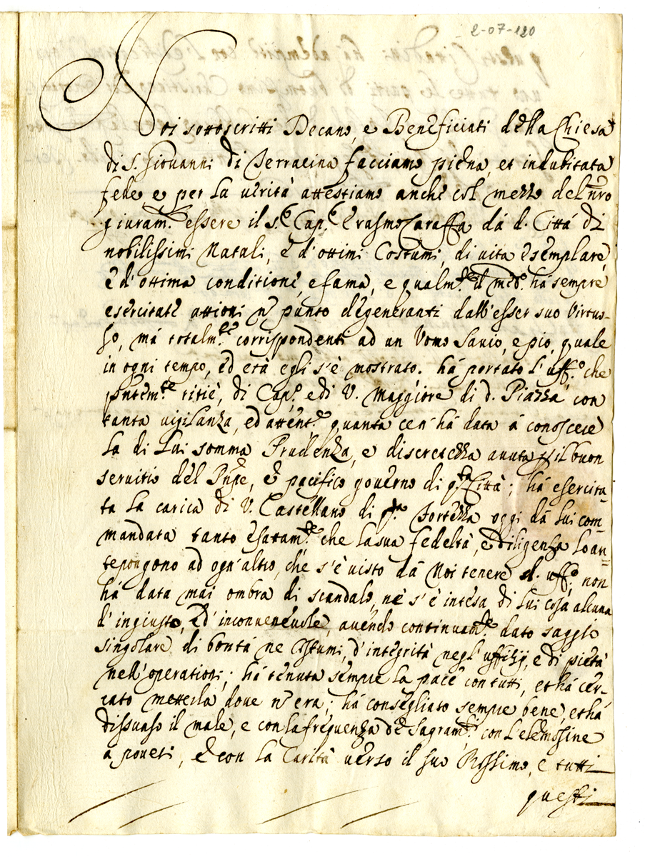 Dichirazione del decano e dei beneficiati della chiesa di san Giovanni di Terracina sull'esemplare condotta morale e professionale del capitano Erasmo Carrafa (1716 ottobre 29)