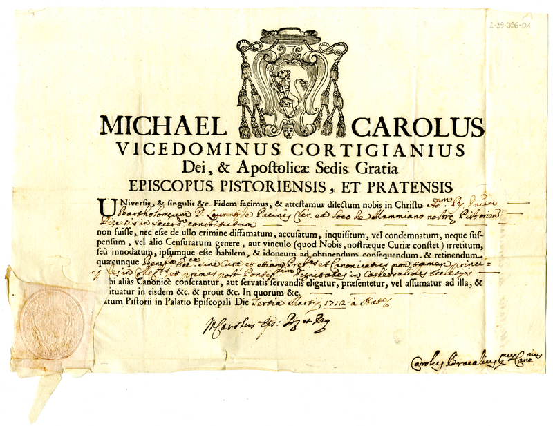 Attestato di idoneità morale e intellettuale a qualunque beneficio ecclesistico rilasciato dal vescovo di Pistoia a favore di don Bartolomeo Lauronzi Pacini, sacerdote di ottima vita sana (1712 marzo 3)