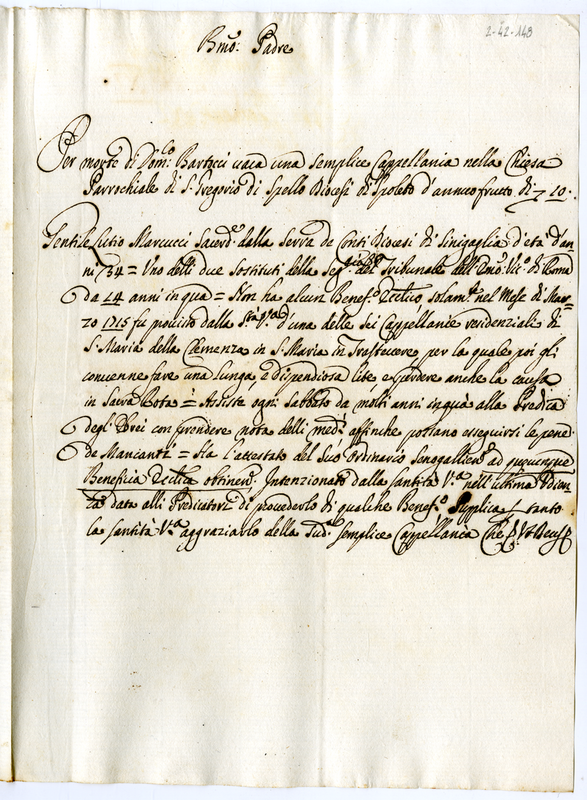 Chiede una cappellania semplice nella chiesa parrocchiale di Spello diocesi di Spoleto vacante per morte di Domenico Bartocci