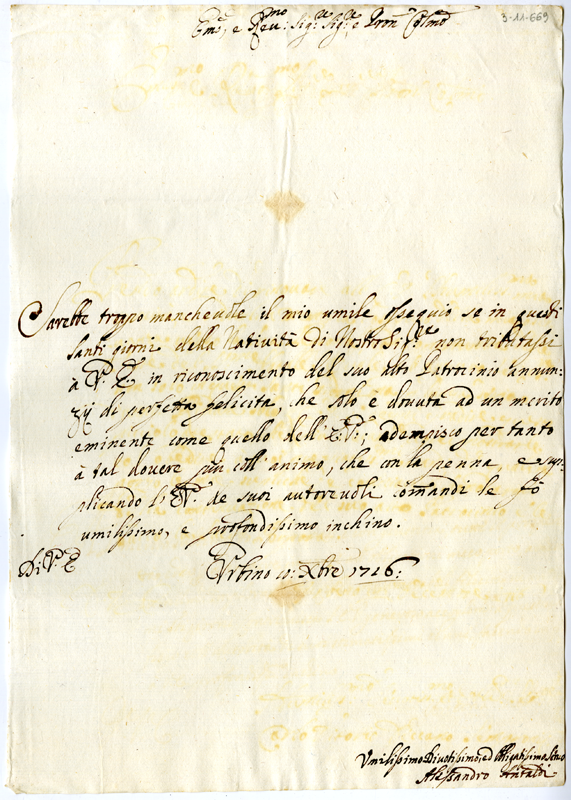 Lettera di Alessandro Antaldi al cardinale Annibale Albani (1716 dicembre 10)