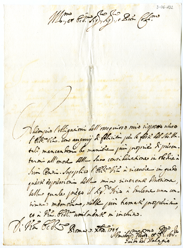 Lettera di Guido del Palagio ad Annibale Albani (1709 dicembre 7)