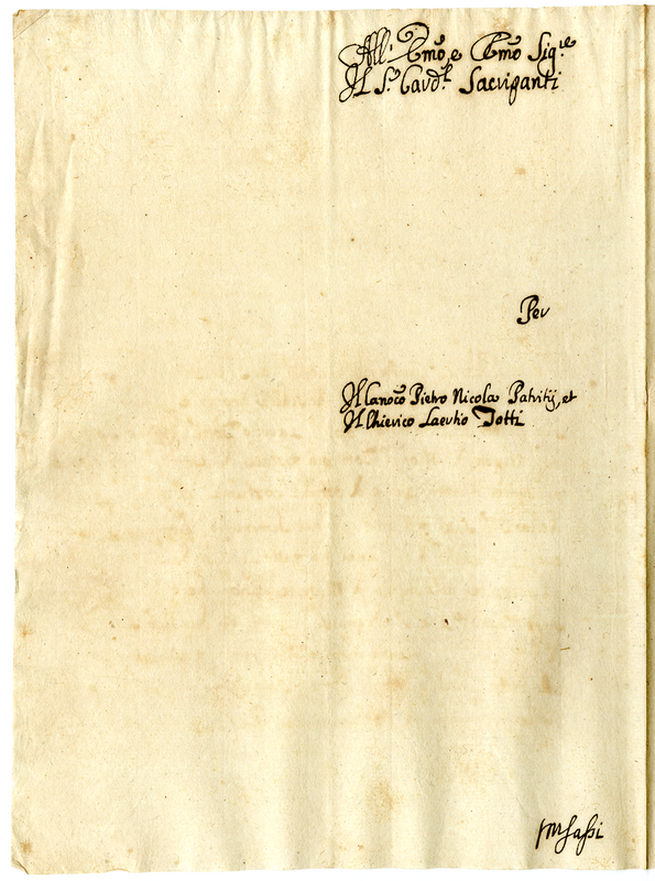 Lettera del canonico Pietro Nicola Patrizij e del chierico Laertio Totti al cardinale Sacripanti (1700-1721)